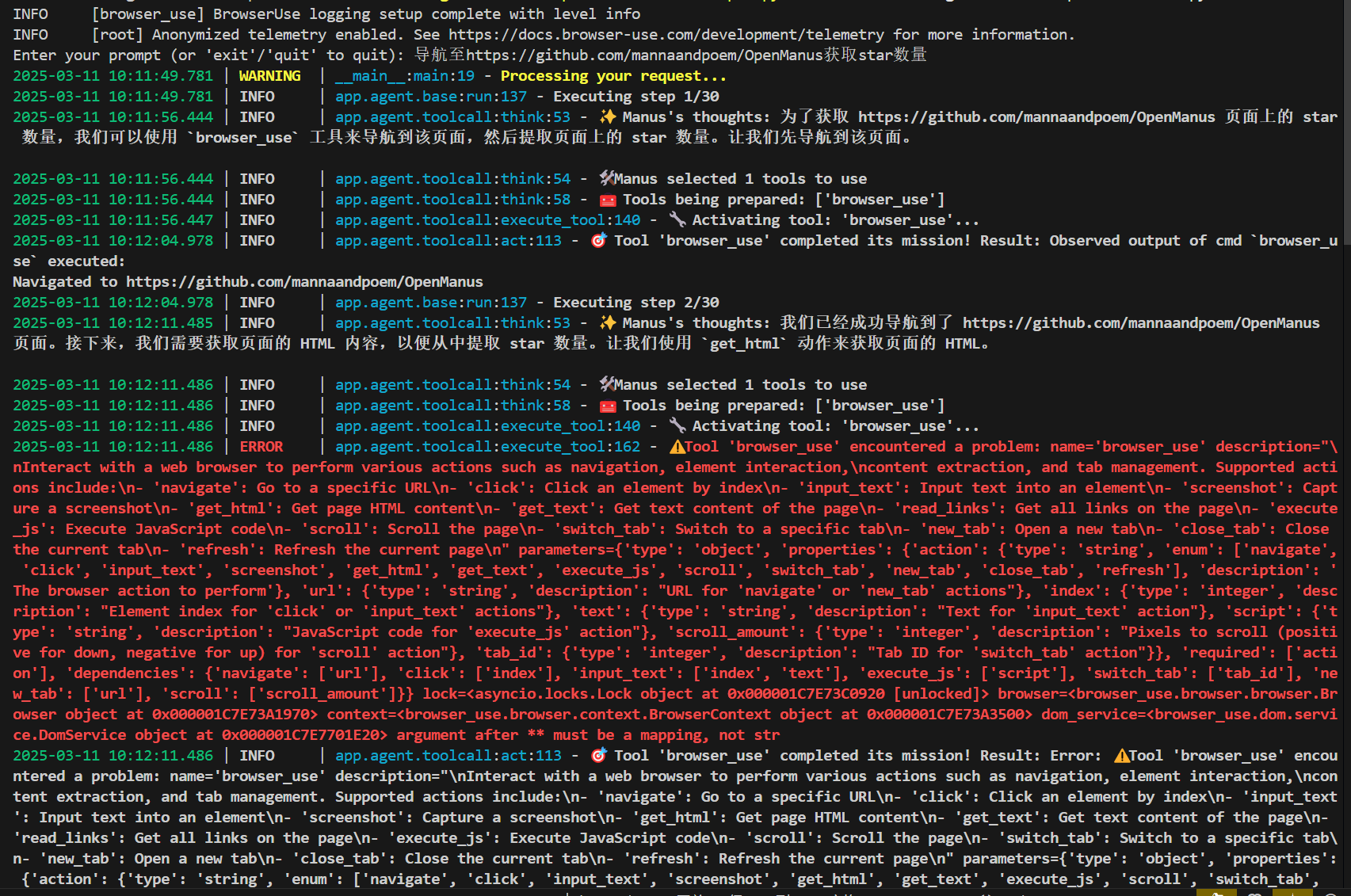 我就以“导航至https://github.com/mannaandpoem/OpenManus获取star数量”为例。
