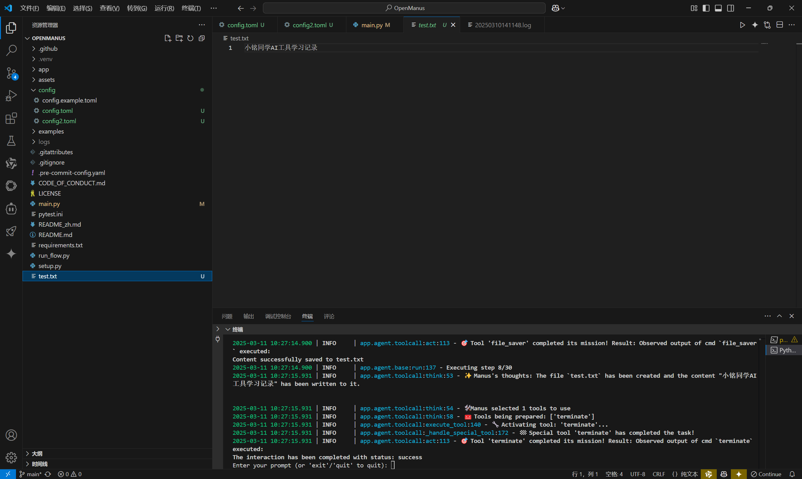 接下来测试一下生成文件的功能,输入“生成一个test.txt文件,里面写入小铭同学AI工具学习记录”。