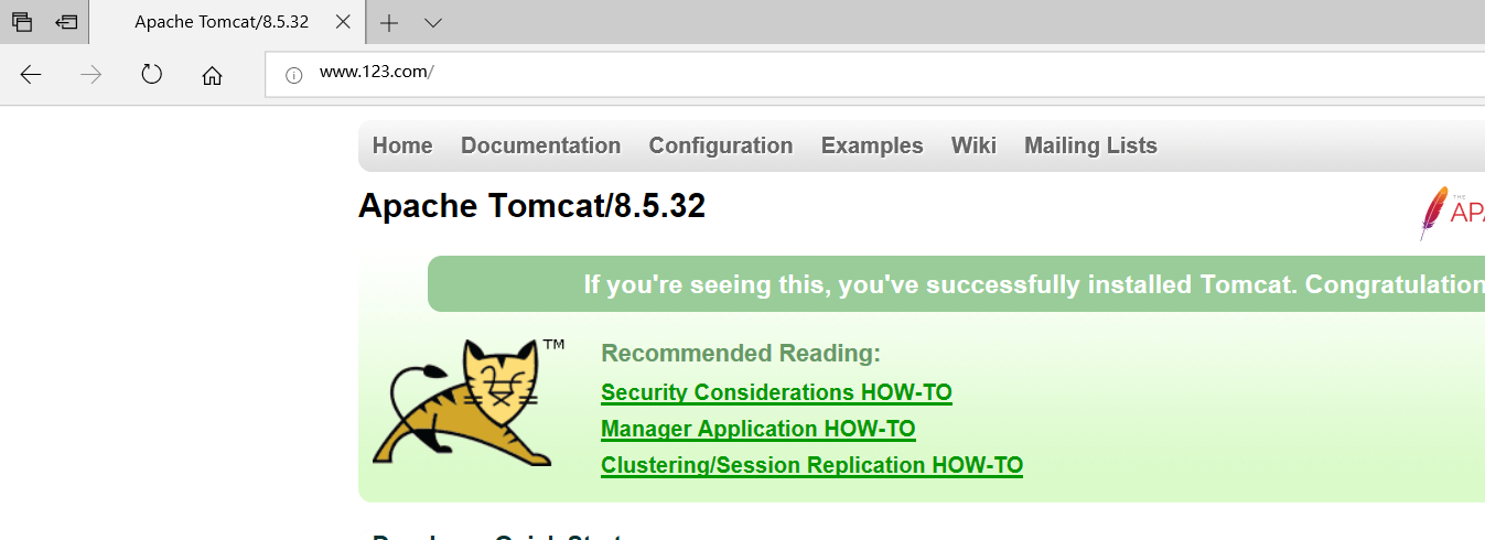 配置完成之后,我们便可以通过 www.123.com:8080 访问到第一步出现的 Tomcat初始界面。