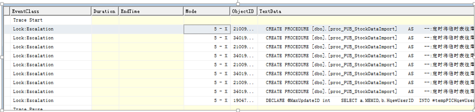 检测方法:在profiler中查看lock:escalation事件类。通过查看Type列,可查看锁升级的范围,升级成表锁(object是表锁)