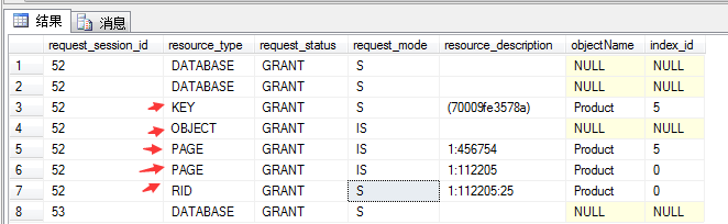 (3)锁住了二个PAGE页加了意向共享锁IS,通过上面执行计划可以看出来,查询出来的数据是通过索引查询50%,RID堆查询50%。这条数据分布在二个页上,通过where SID来查找没有完全走索引查找。