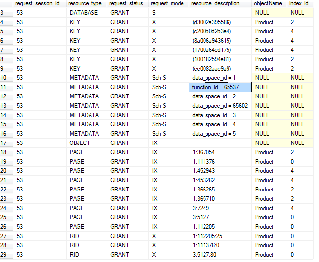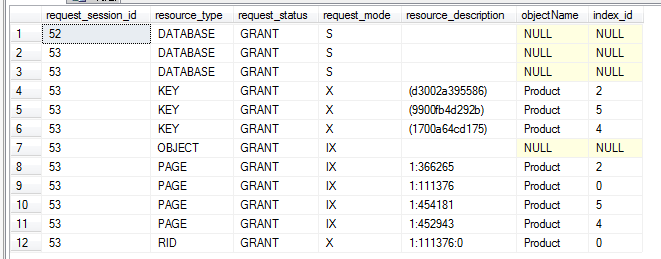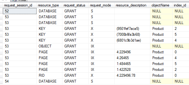 --上面执行完后,打开另一会话查询锁状态 SELECT k.request_session_id,k.resource_type,k.request_status,k.request_mode,k.resource_description, OBJECT_NAME( p.object_id) as objectName,p.index_id FROM SYS.dm_tran_locks k LEFT JOIN SYS.PARTITIONS p ON k.resource_associated_entity_id=p.hobt_id ORDER BY request_session_id,resource_type