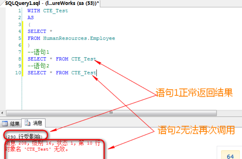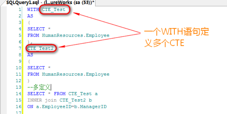 由于CTE只能在接下来一条语句中使用,因此,当需要接下来的一条语句中引用多个CTE时,可以定义多个,中间用逗号分隔: