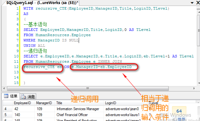 对于递归公用表达式来说,实现原理也是相同的,同样需要在语句中定义两部分: