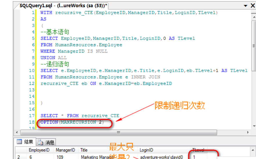 当然,越强大的力量,就需要被约束.如果使用不当的话,递归CTE可能会出现无限递归。从而大量消耗SQL Server的服务器资源.因此,SQL Server提供了OPTION选项,可以设定最大的递归次数:
