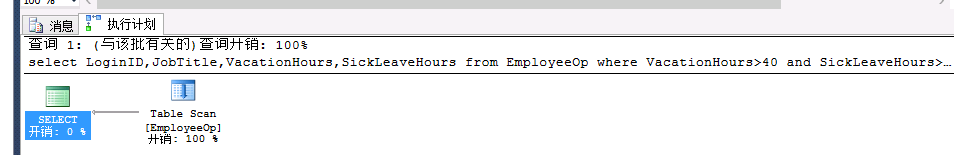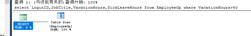 select LoginID,JobTitle,VacationHours,SickLeaveHours from EmployeeOp where VacationHours>40 --table scan>10% |