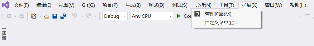 在Visual Studio 顶部菜单中,点击”扩展” > “管理扩展”,具体如下图所示: