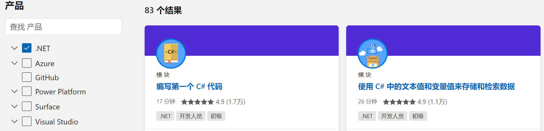 在 Learns 板块中提供了大约83个.NET相关内容。具体请参考链接:https://docs.microsoft.com/zh-cn/learn/browse/?products=dotnet。
