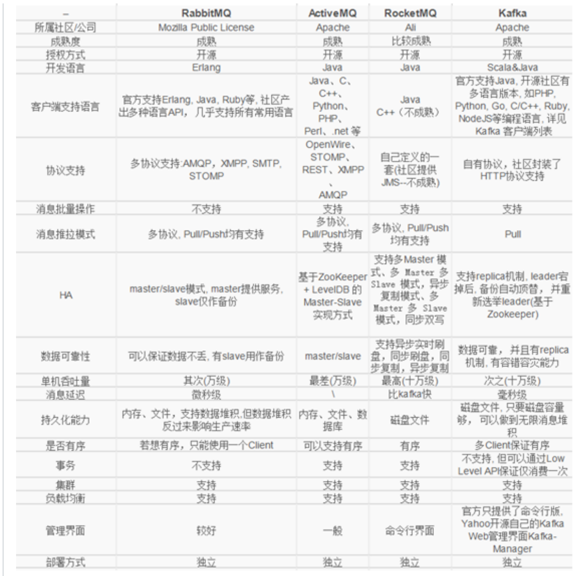 1、RabbitMQ 稳定可靠,数据⼀致,⽀持多协议,有消息确认,基于erlang语⾔2、Kafka ⾼吞吐,⾼性能,快速持久化,⽆消息确认,⽆消息遗漏,可能会有有重复消息,依赖于zookeeper,成本⾼.3、ActiveMQ 不够灵活轻巧,对队列较多情况⽀持不好.4、RocketMQ 性能好,⾼吞吐,⾼可⽤性,⽀持⼤规模分布式,协议⽀持单⼀