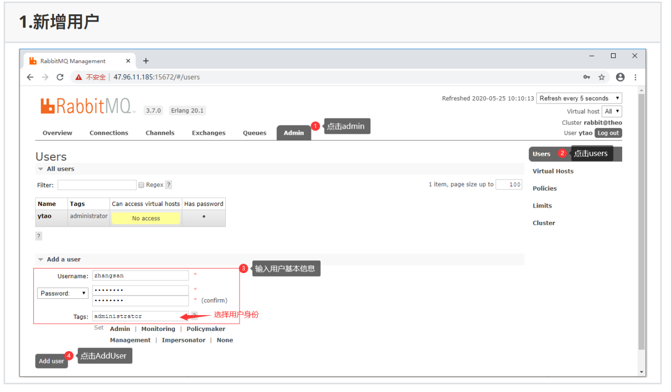 ## 进⼊到rabbit_mq的sbin⽬录 cd /usr/local/rabbitmq_server-3.7.0/sbin ## 新增⽤户 ./rabbitmqctl add_user ytao admin1232、设置⽤户级别