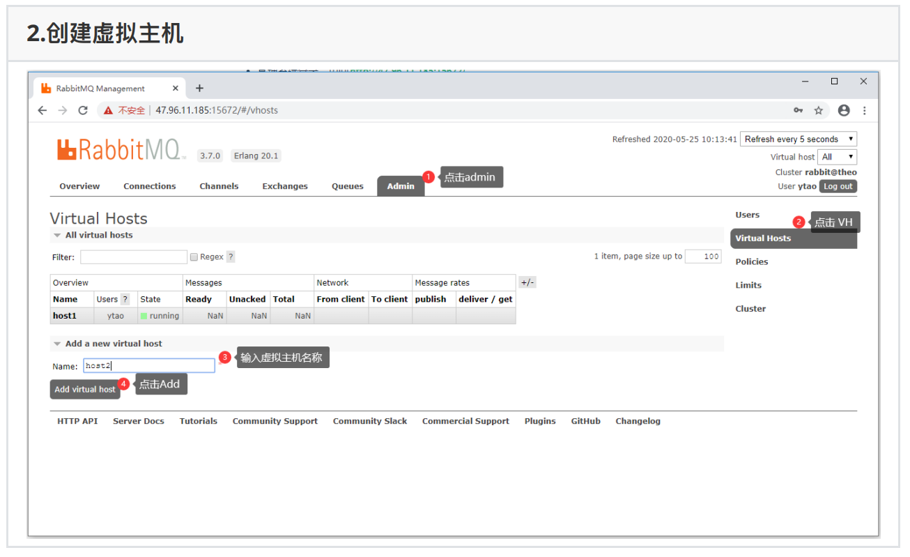 RabbitMQ默认提供了⼀个guests账号,但是此账号不能⽤作远程登录,也就是不能在管理系统的登录;我们可以创建⼀个新的账号并授予响应的管理权限来实现远程登录