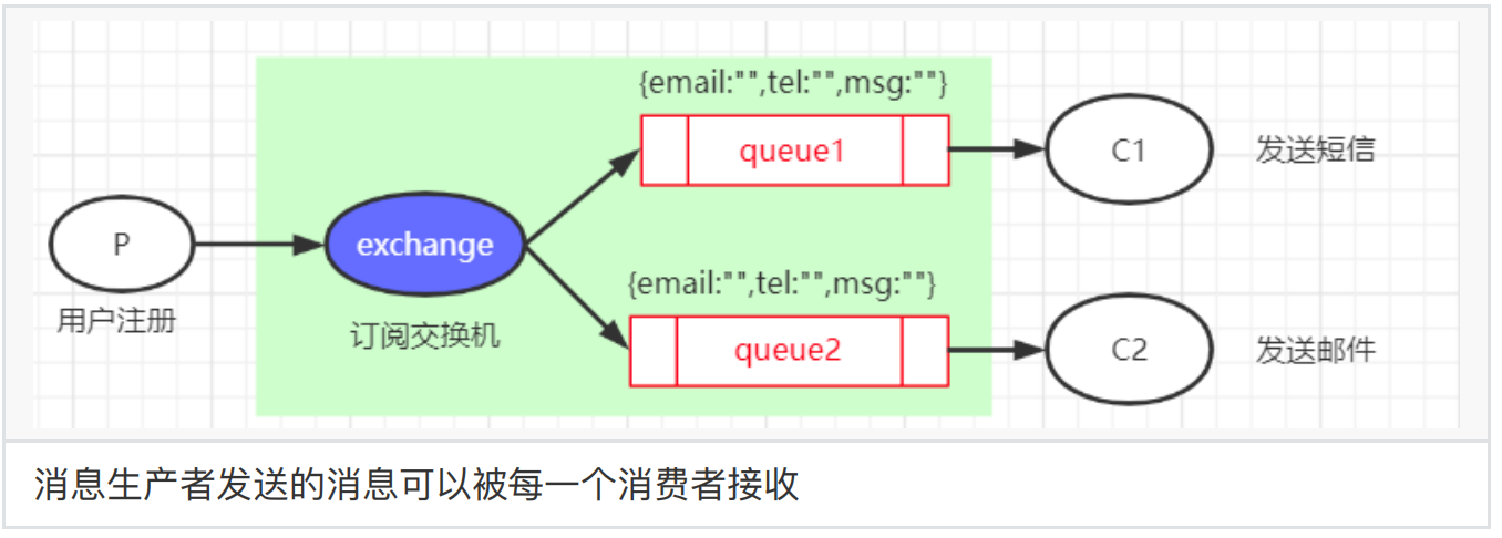 ⼀个交换机绑定多个消息队列,每个消息队列有⼀个消费者监听
