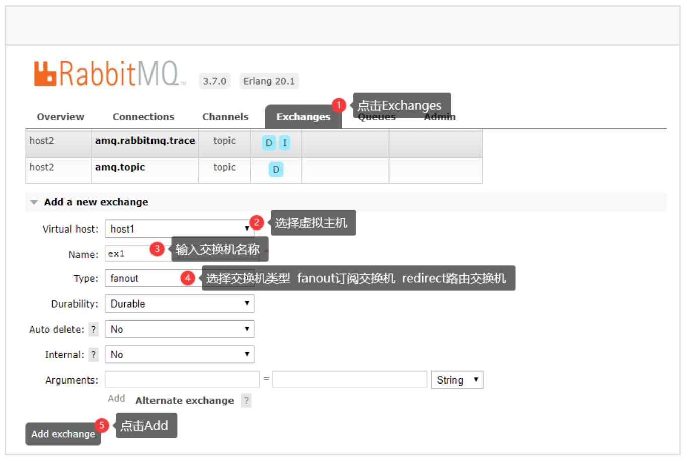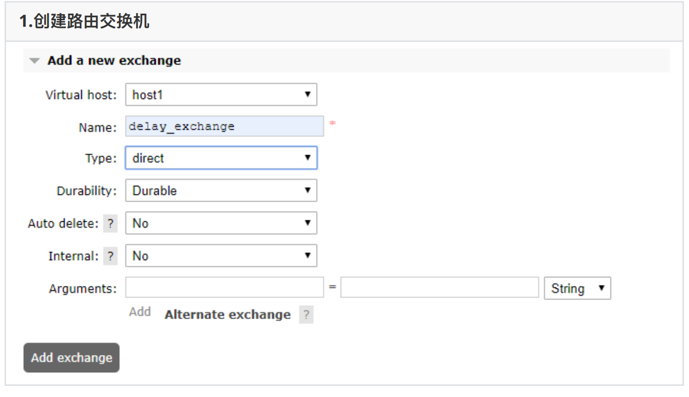 //1.定义队列 (使⽤Java代码在MQ中新建⼀个队列) //参数1:定义的队列名称 //参数2:队列中的数据是否持久化(如果选择了持久化) //参数3: 是否排外(当前队列是否为当前连接私有) //参数4:⾃动删除(当此队列的连接数为0时,此队列会销毁(⽆论队列中是否还有数据)) //参数5:设置当前队列的参数 channel.queueDeclare("queue7",false,false,false,null);2、新建交换机