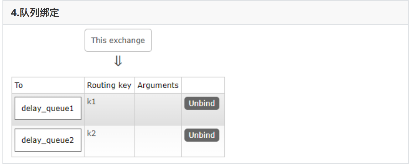 //绑定队列 //参数1:队列名称 //参数2:⽬标交换机 //参数3:如果绑定订阅交换机参数为"",如果绑定路由交换机则表示设置队列的key channel.queueBind("queue7","ex4","k1"); channel.queueBind("queue8","ex4","k2");