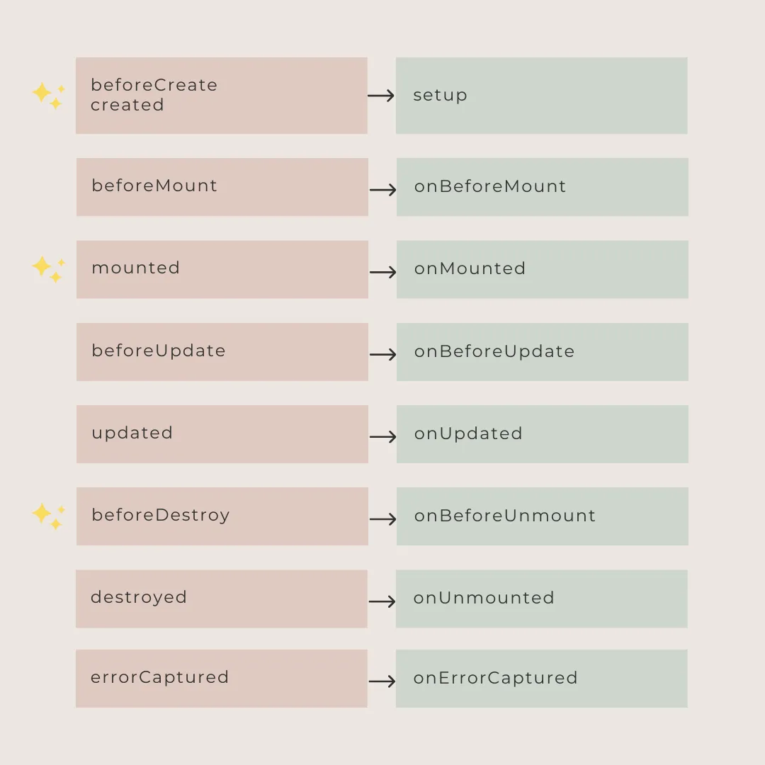 所有组件生命周期函数都通过添加on前缀或完全更名实现,下图详细列出了具体的变化: