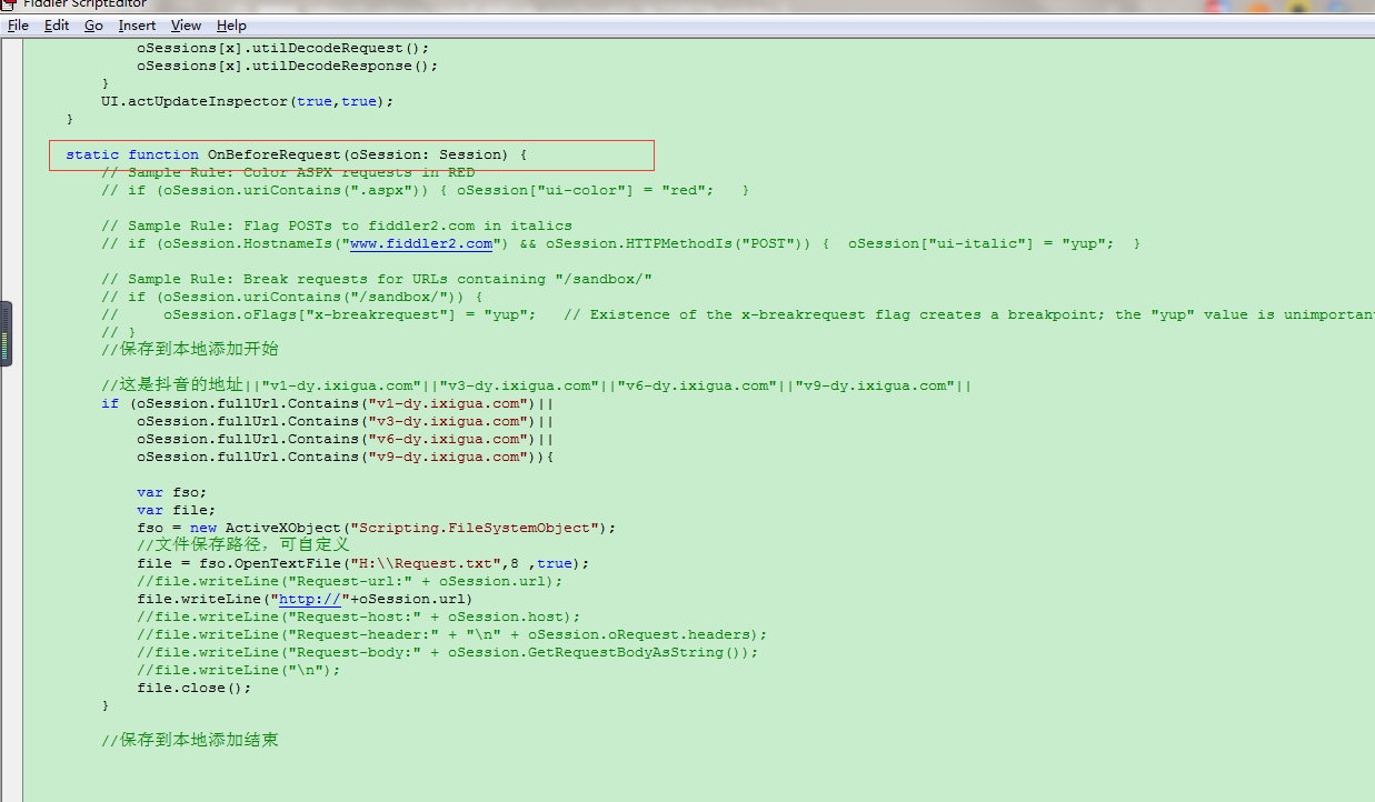 看到这些url,楼主不能手动一个一个粘贴,so楼主需要在+Fiddler4中(在Fiddler4使用script代码网上有大量详细教程)使用如下代码,自动保存到一个txt文档中。