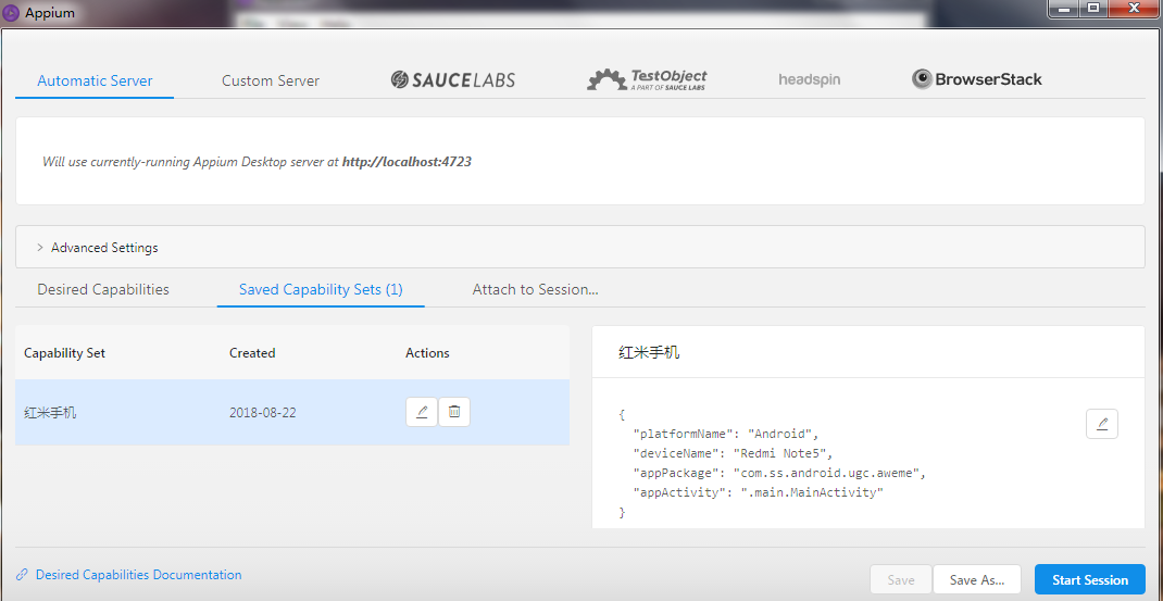 首先需要在appium中得到抖音这个app包的一些用的信息,如下图所示