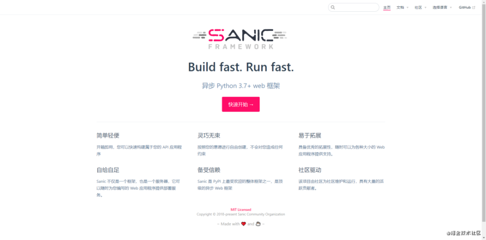 但 Sanic 拥有完善的 中文用户指南 和 API 文档,这些都是由贡献者自主发起的,官方承认的文档,由翻译者进行翻译贡献,由 Sanic 官方团队进行发布。或许有的小伙伴会说 Flask 也有完善的中文文档,但是那是在不同的站点上的,Sanic 的所有文档都有 Sanic 官方进行发布支持。且目前 Sanic 还在持续支持 韩语、葡萄牙语等更多的语种。